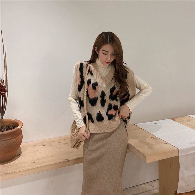 / 時尚撞色V領無袖豹紋針織背心馬甲+高領打底衫+針織包臀裙三件套
