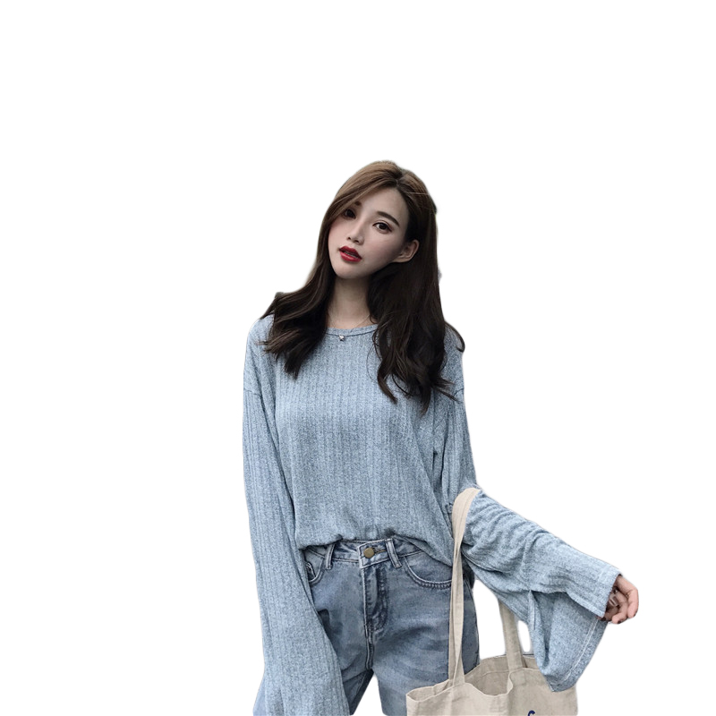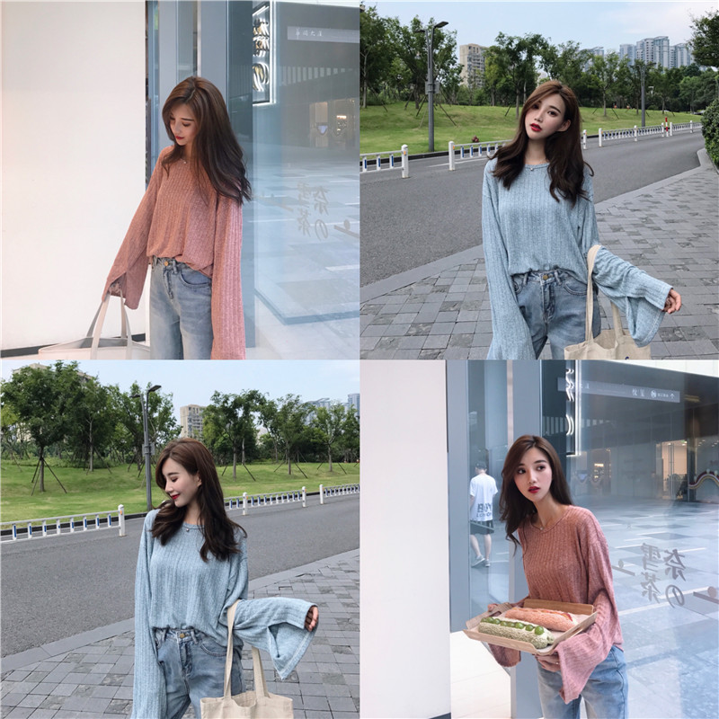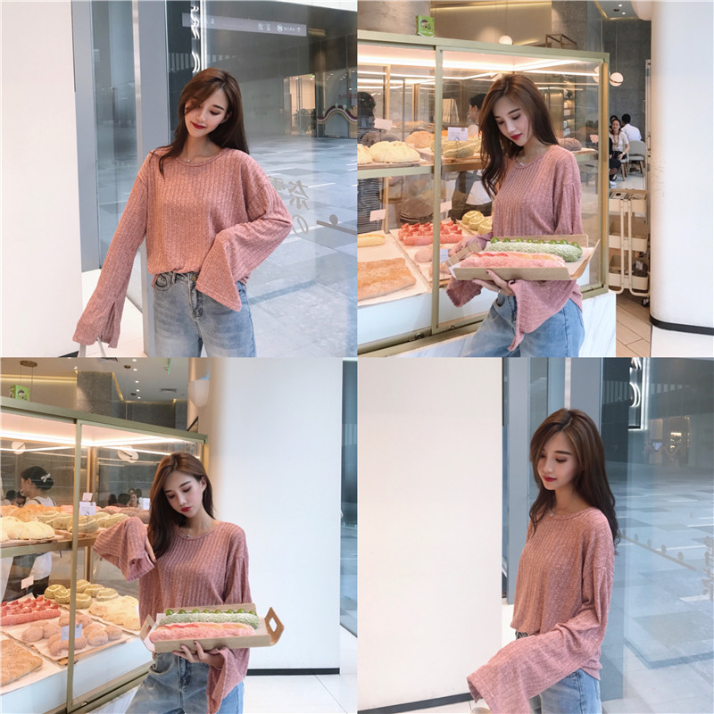港妹潮人館~坑條chic慵懶袖子開叉長袖寬松T恤女