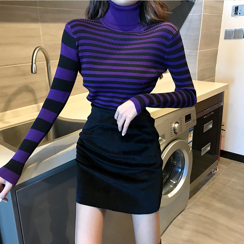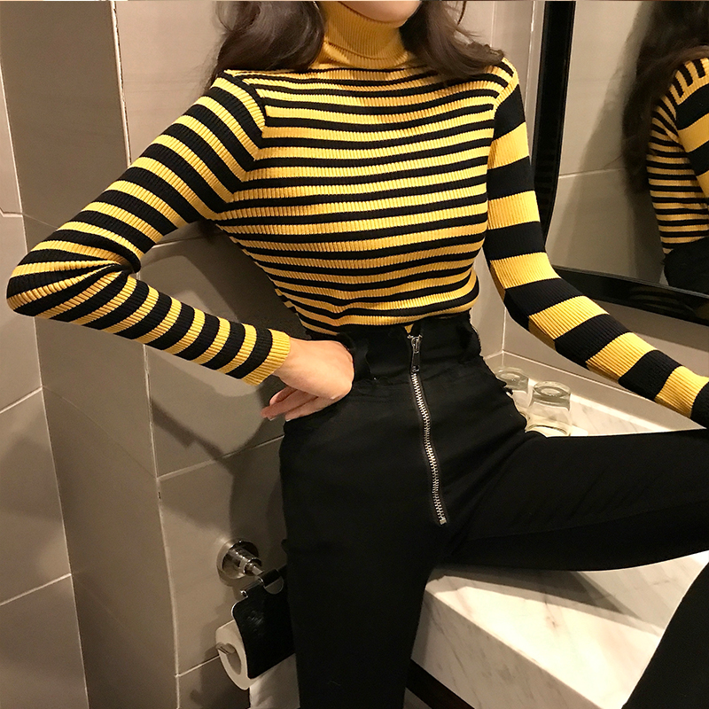 / 秋冬新款韓版百搭修身顯瘦高領條紋chic長袖上衣女百搭打底針織衫