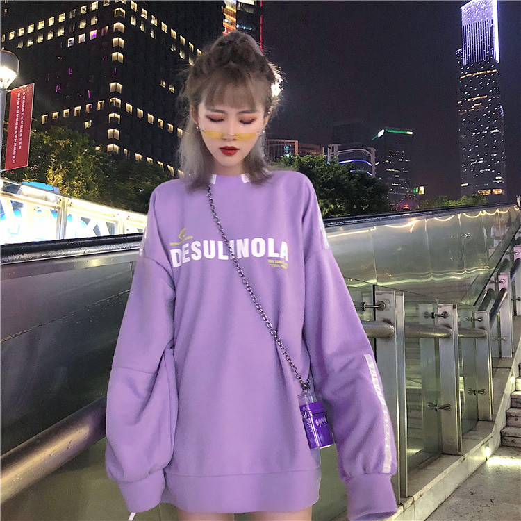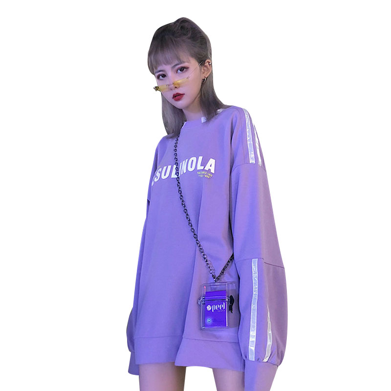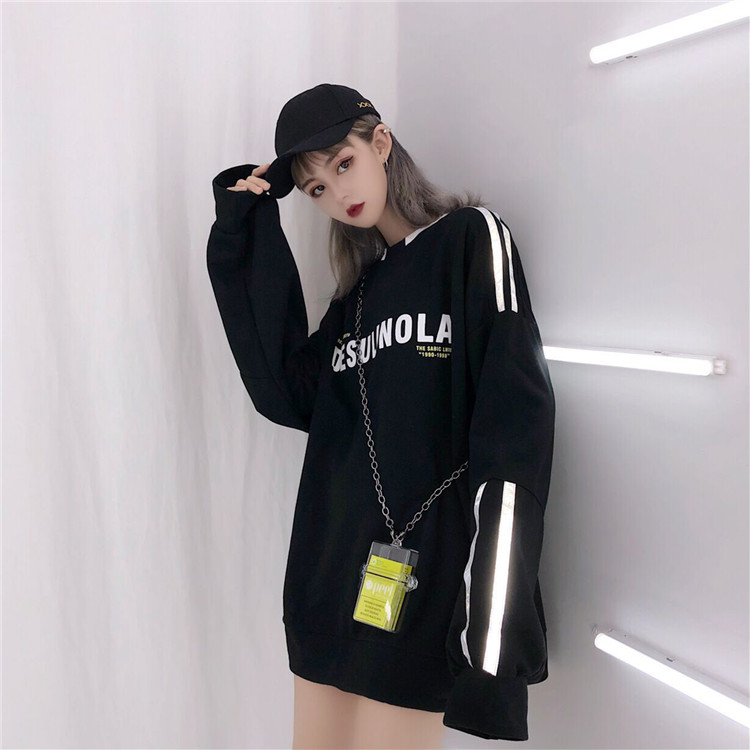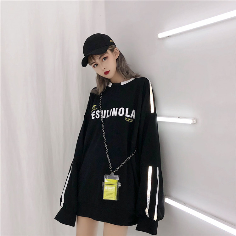 / 秋季韓版原宿風反光條字母寬松中長款情侶長袖套頭衛衣上衣外套女
