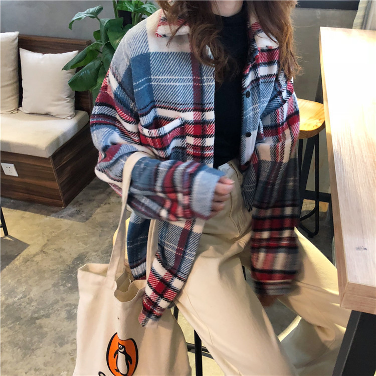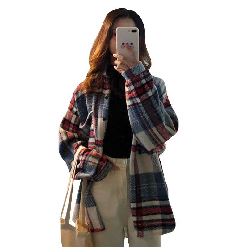/ 秋冬韓版chic中長款復古格子毛呢襯衫寬松休閑港風襯衣上衣外套女