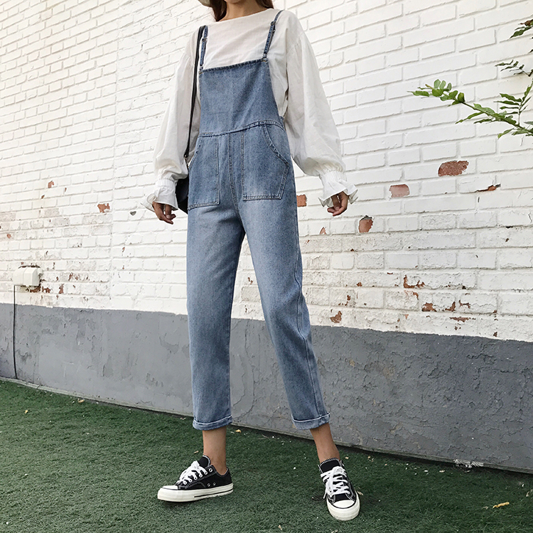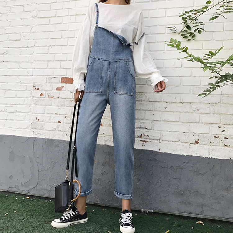 / 早春新款女裝直筒寬松顯瘦學生吊帶褲復古九分小腳背帶牛仔褲女