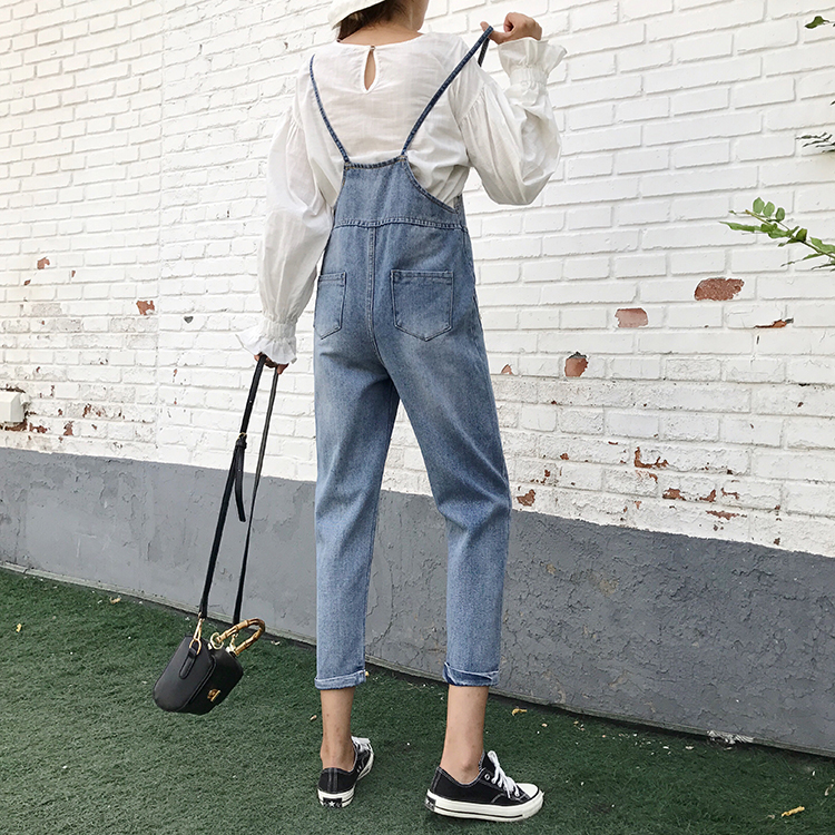 早春新款女裝直筒寬松顯瘦學生吊帶褲復古九分小腳背帶牛仔褲女