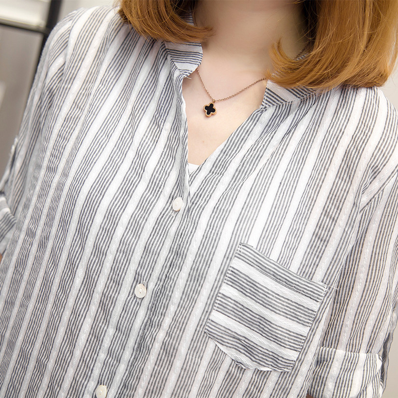 / 夏裝新款hm女裝條紋襯衫女上衣寬松韓范小清新短袖襯衣女學生