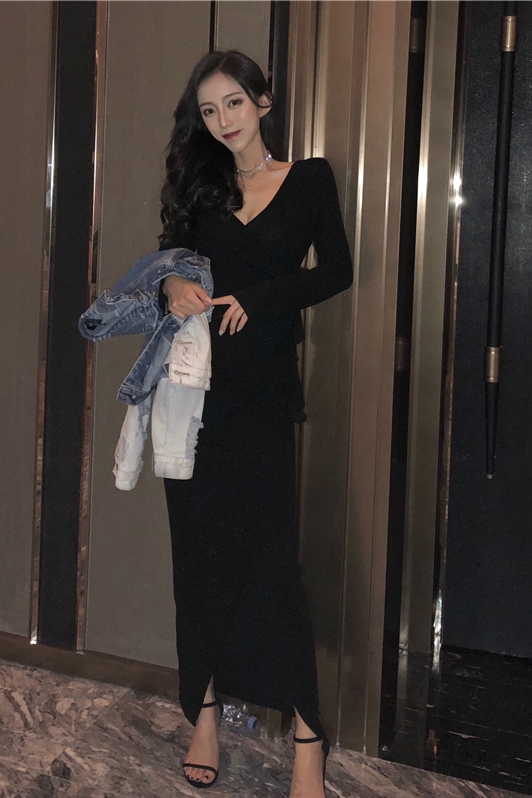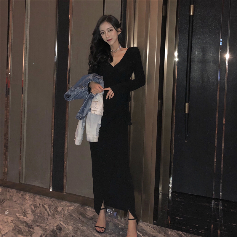 復古港味早秋顯瘦修身長裙新款百搭chic長袖V領性感氣質連衣裙女
