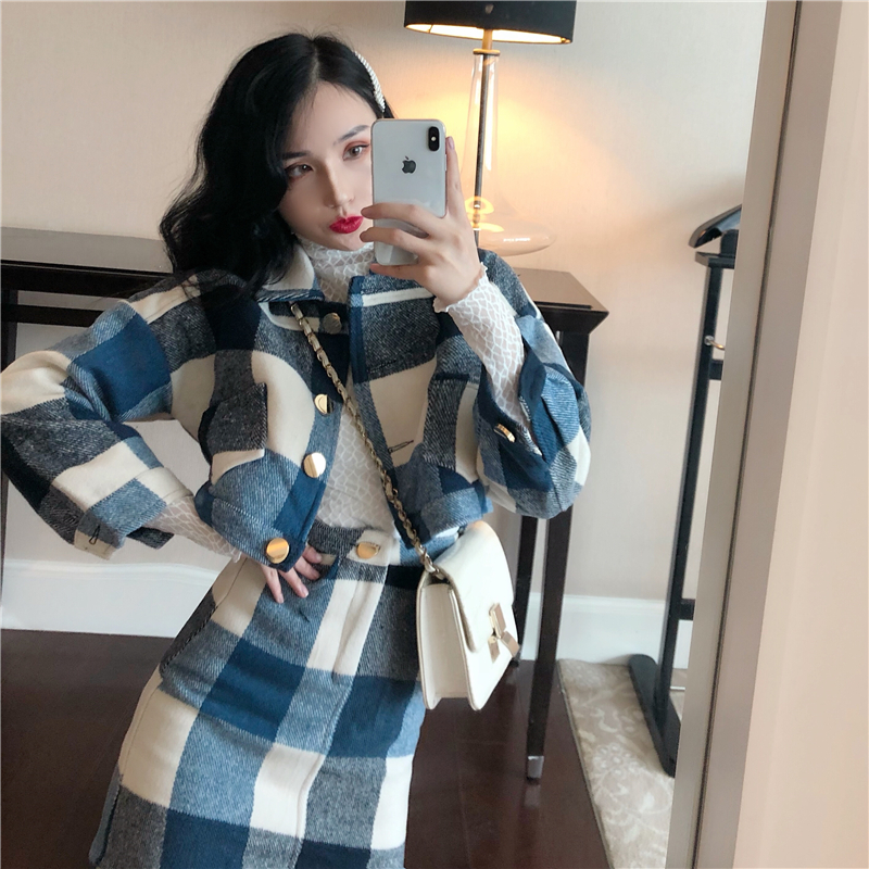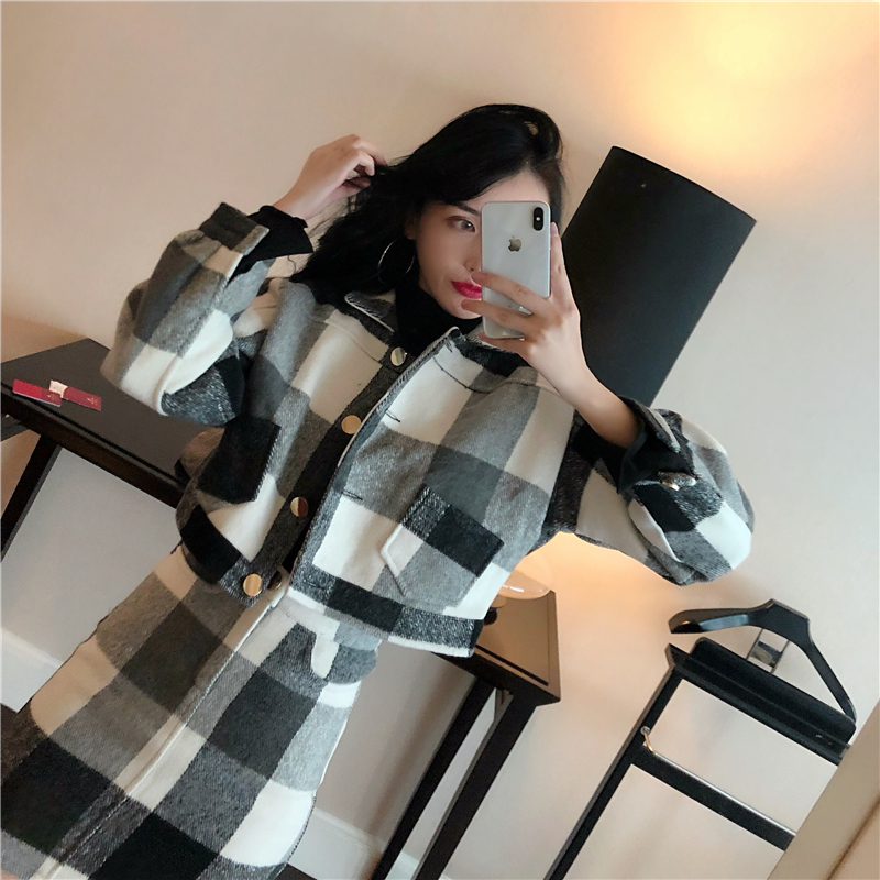 韓版時尚秋裝女2018新款套裝格子毛呢外套女+半身裙時尚兩件套潮