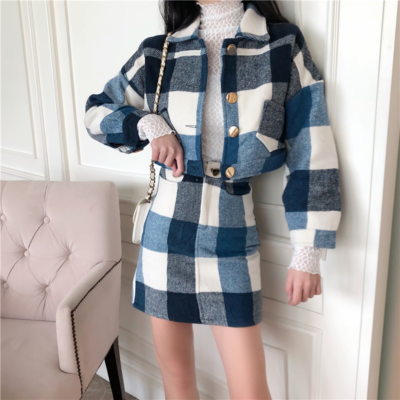 / 韓版時尚秋裝女2018新款套裝格子毛呢外套女+半身裙時尚兩件套潮