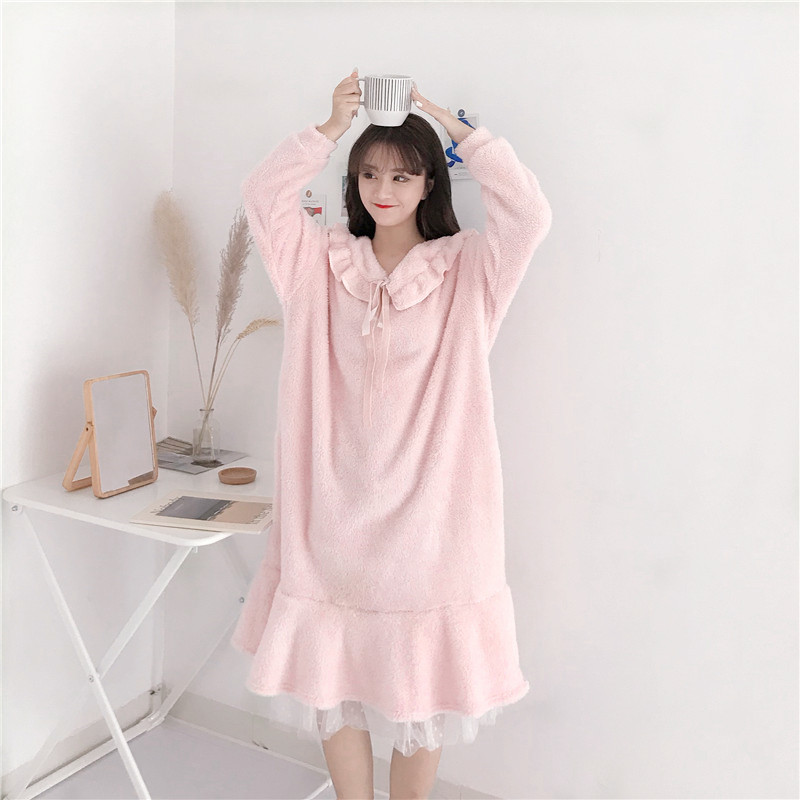 / 秋冬女裝韓版甜美可愛珊瑚絨家居服睡裙中長款寬松長袖睡衣連衣裙
