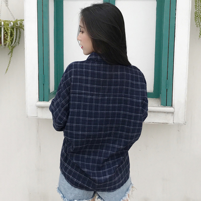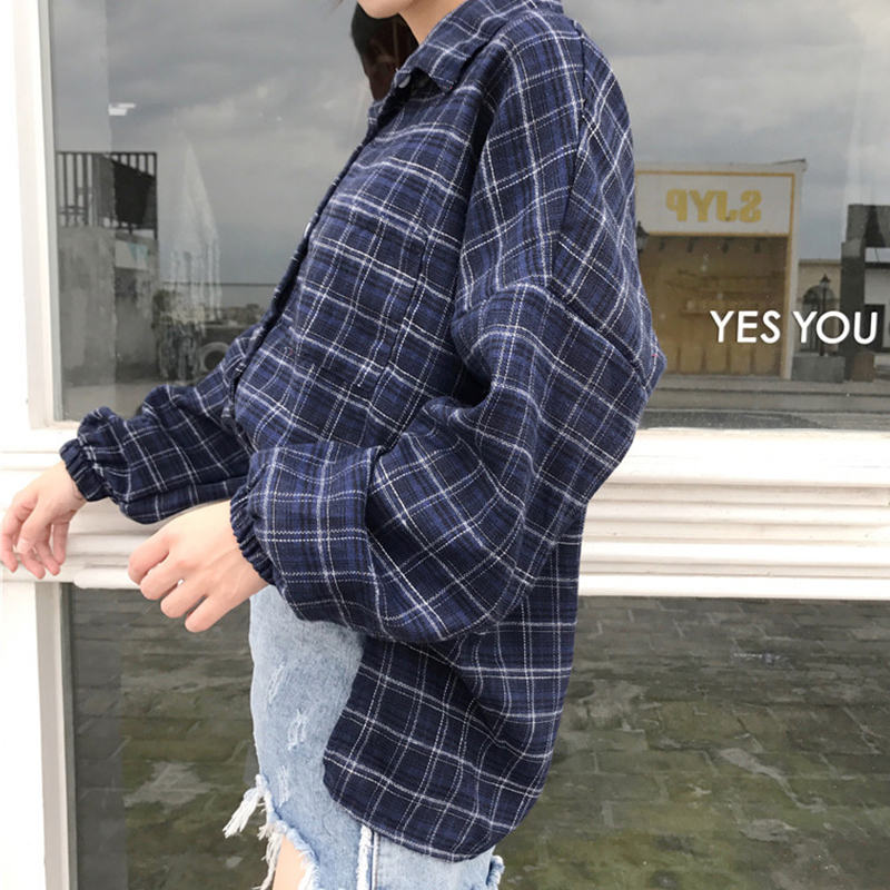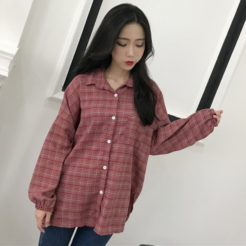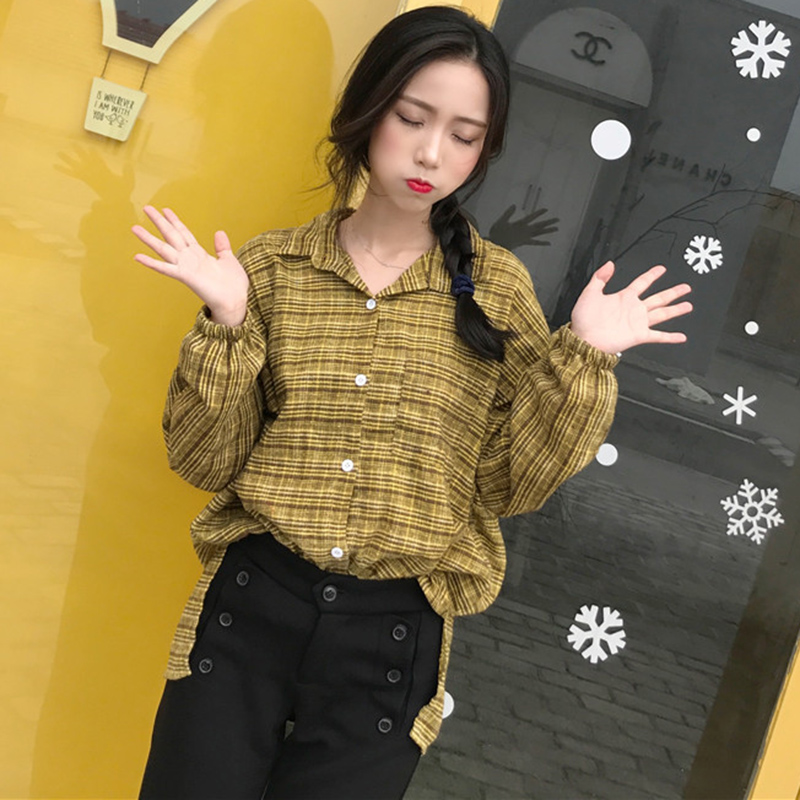 / 寬松口袋開叉燈籠長袖襯衣早秋新款女裝學生復古百搭翻領格子襯衫