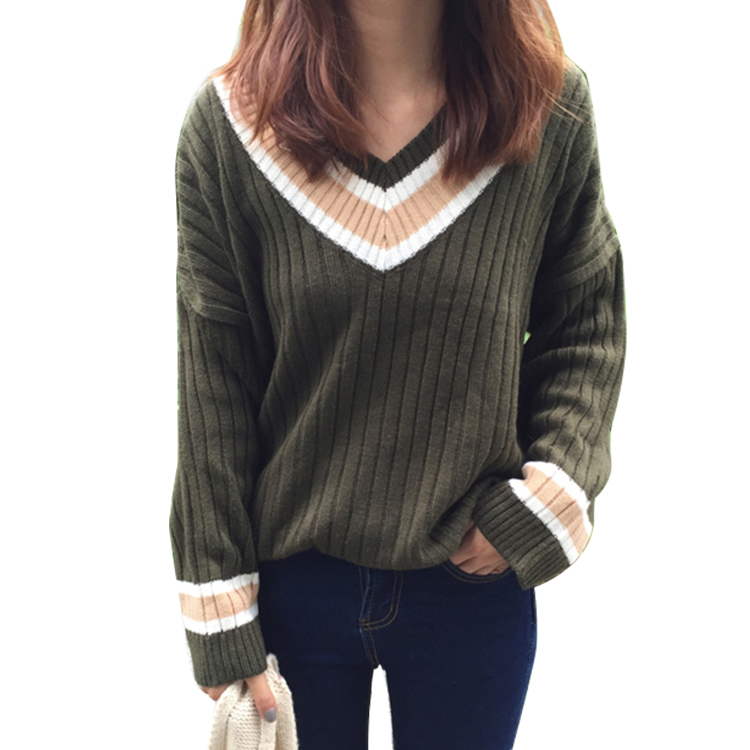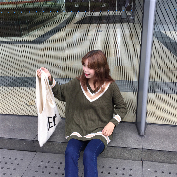 韓版寬松撞色v領女裝毛衣外套新款秋裝大碼套頭長袖針織衫上衣潮