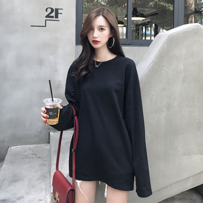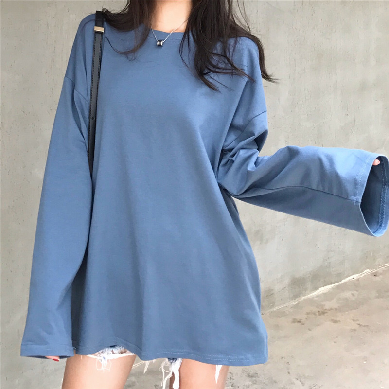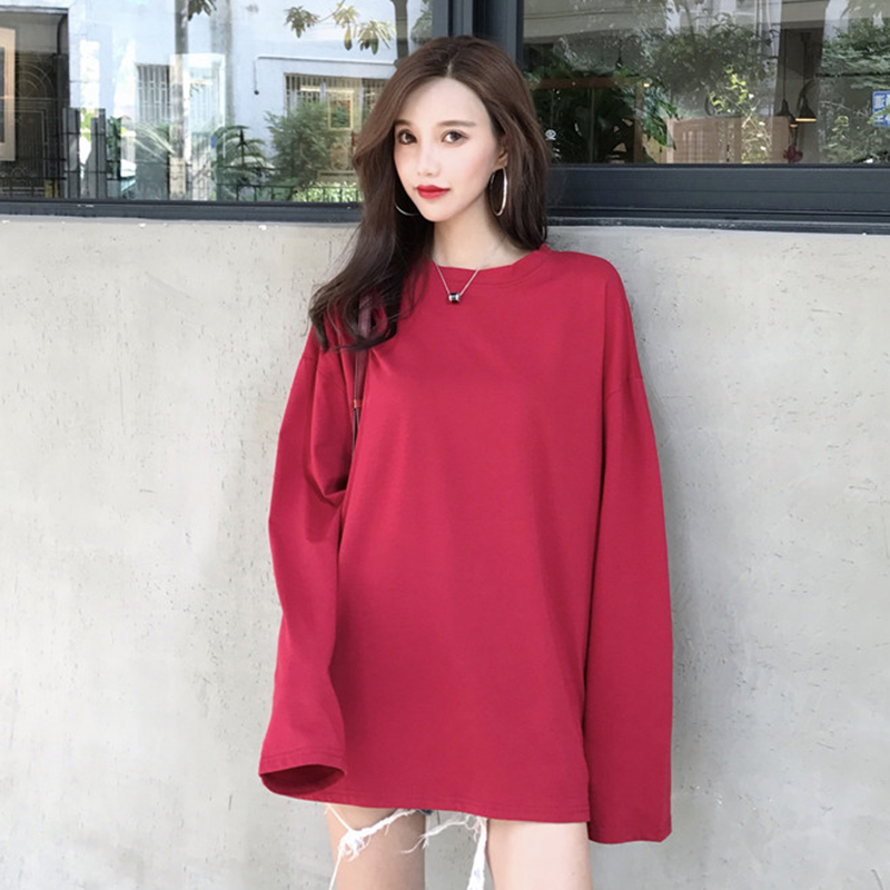 / 糖果色寬松長袖T恤女秋裝新款韓版學院風簡約圓領中長款上衣體恤
