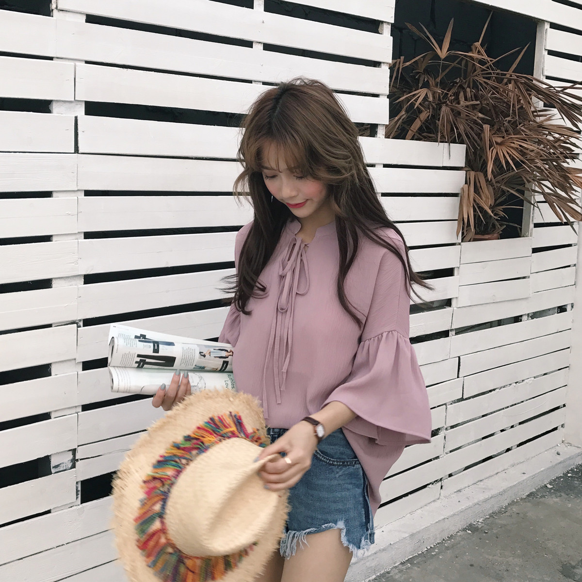 / 春夏女裝韓版復古百搭領口系帶襯衣寬松喇叭袖短袖雪紡衫襯衫上衣