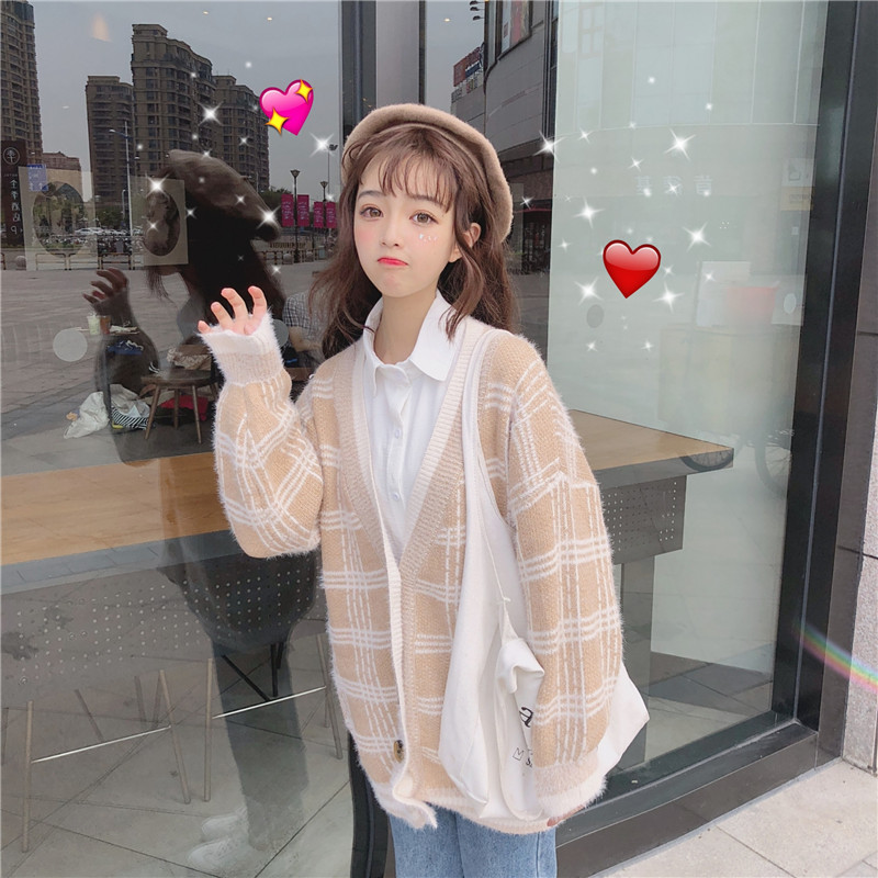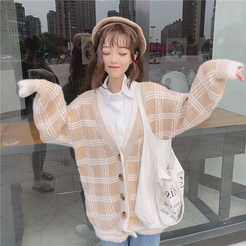 2018新款秋冬女裝韓版慵懶風寬松軟妹格子網紅針織衫毛衣開衫外套