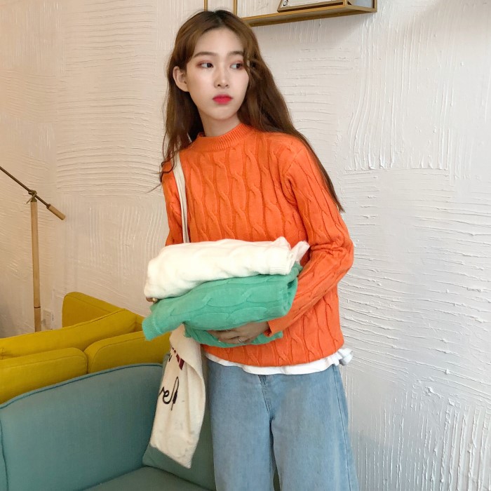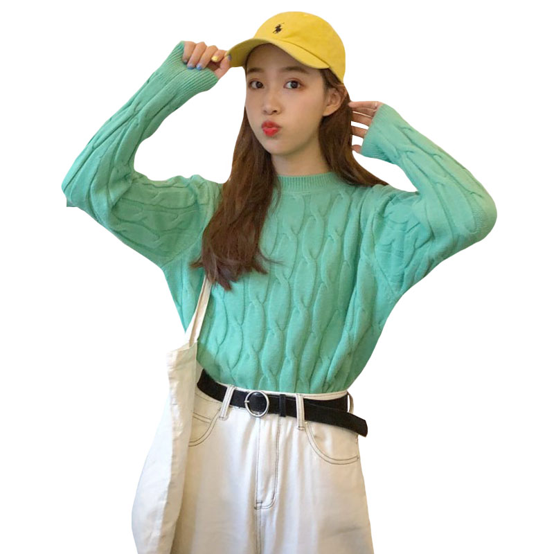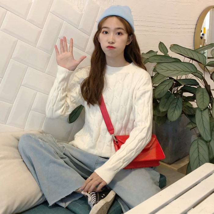 / 秋季女裝韓版慵懶風寬松純色麻花套頭網紅甜美針織衫毛衣上衣外套