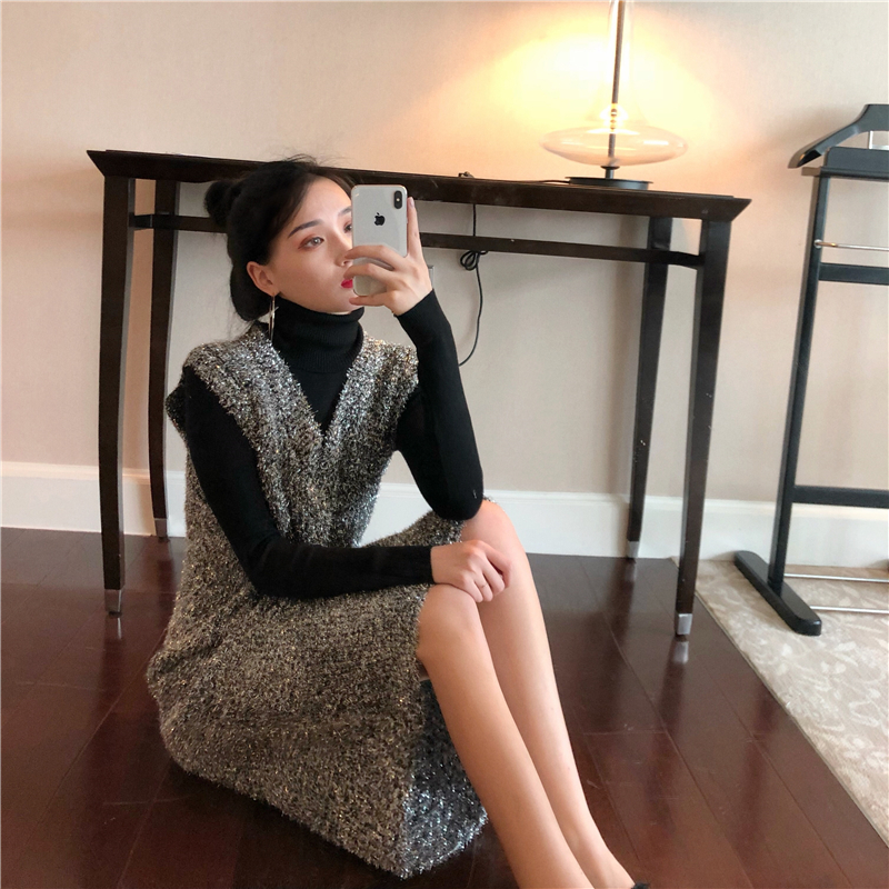 港味時尚女神套裝秋冬新款寬松亮閃針織長裙+加厚高領毛衣兩件套