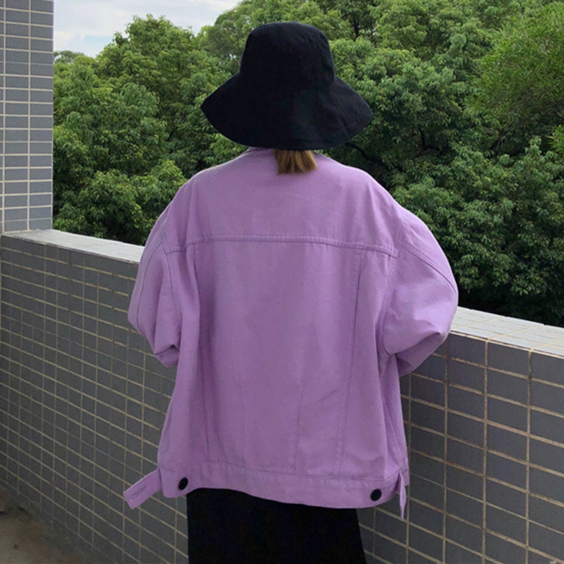 / 復古格子拼接牛仔外套秋冬女裝新款學生翻領寬松長袖夾克開衫上衣