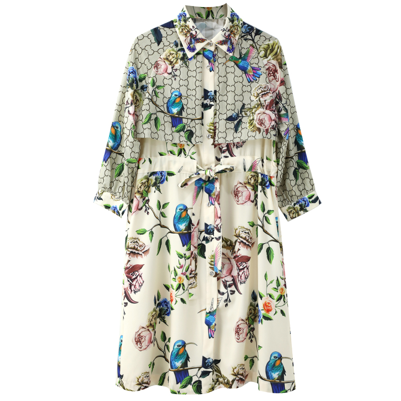 / S秀文藝風2018秋季新款花色長袖蝴蝶結系帶波浪印花收腰連衣裙潮