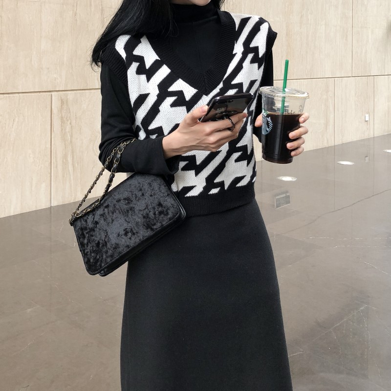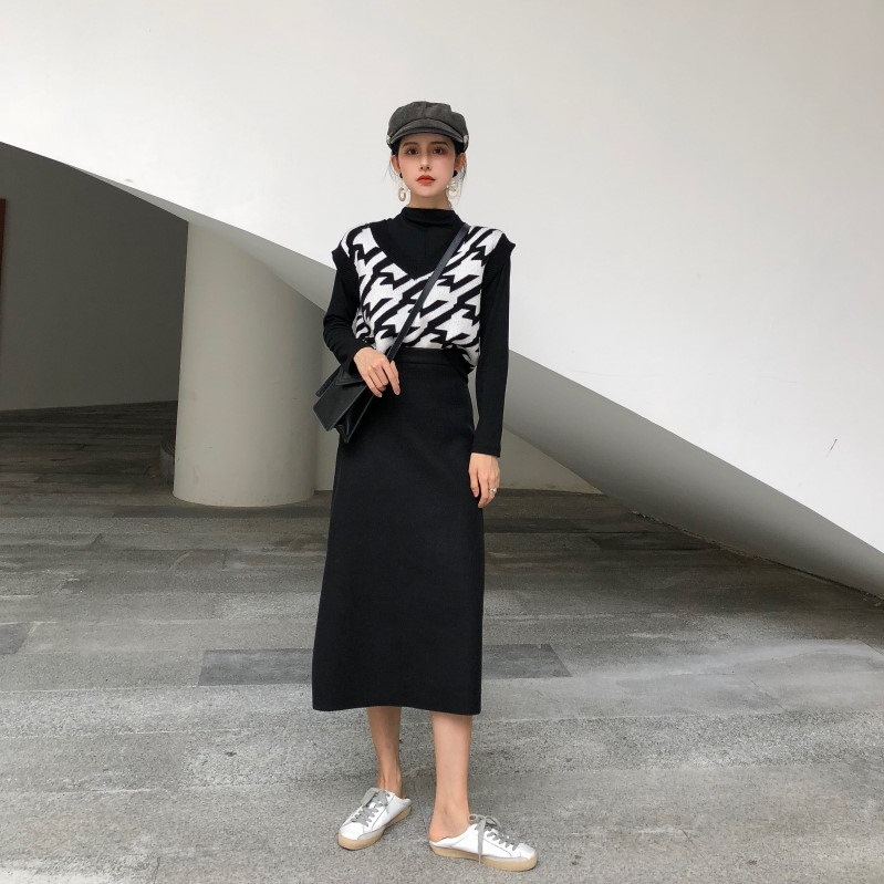 / 韓版百搭撞色邊V領背心馬甲+長袖打底衫+中長款半身裙時尚三件套