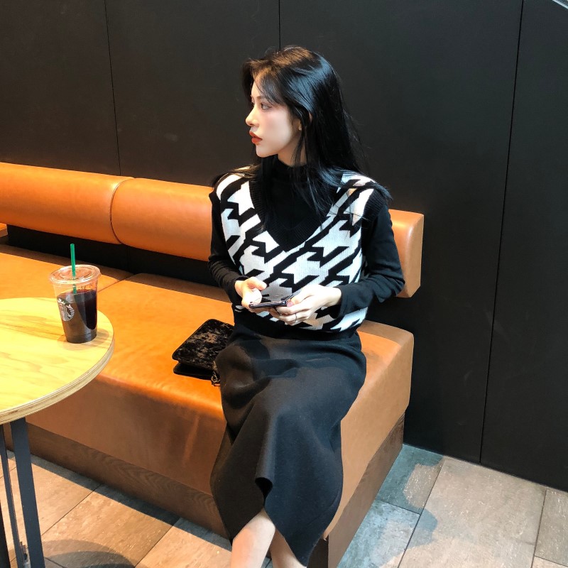 秋裝女2018新款網紅氣質女神毛衣針織馬甲+長款黑色打底連衣裙女