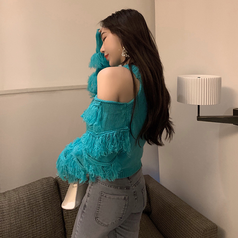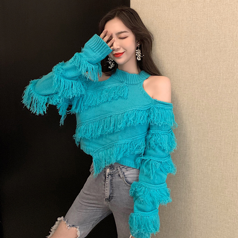 / 秋季新款女裝慵懶風時尚寬松套頭長袖上衣洋氣流蘇露肩短毛衣外套