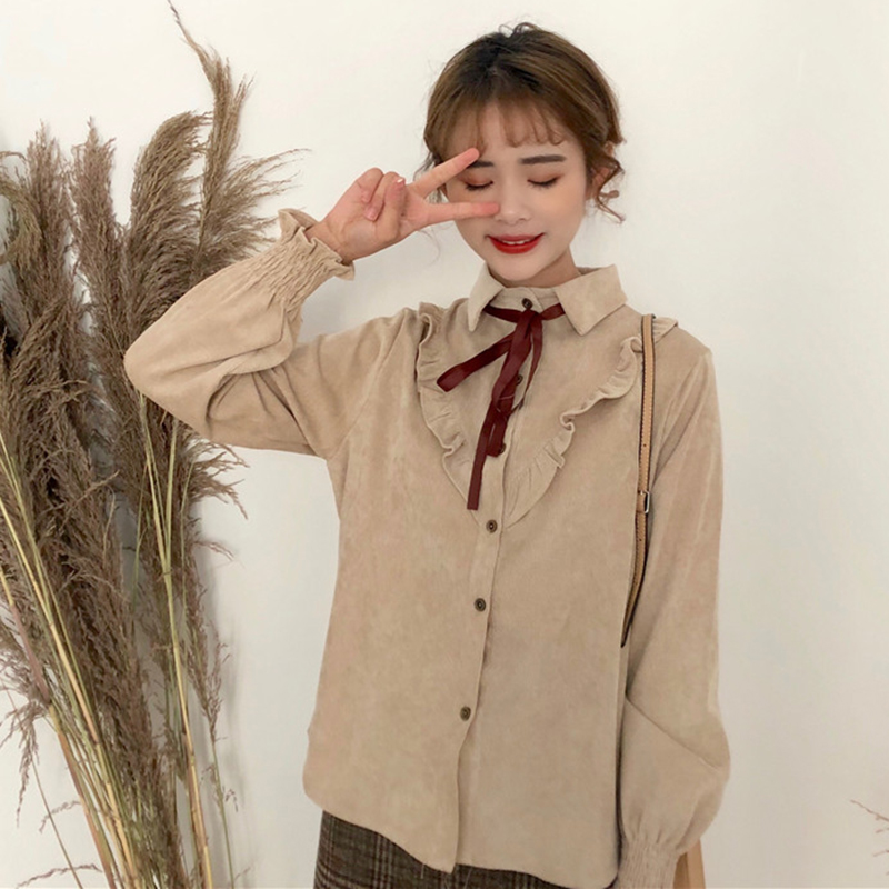 / 小清新燈芯絨蝴蝶結荷葉白襯衫女秋裝新款學院風學生寬松長袖上衣