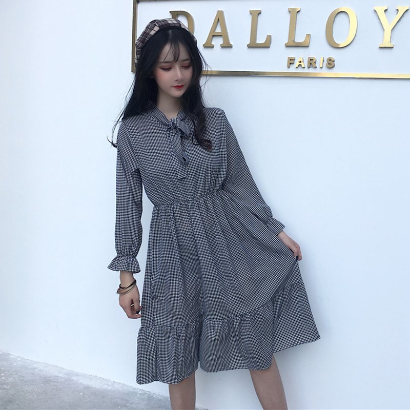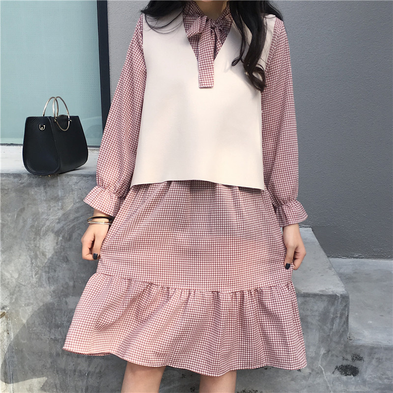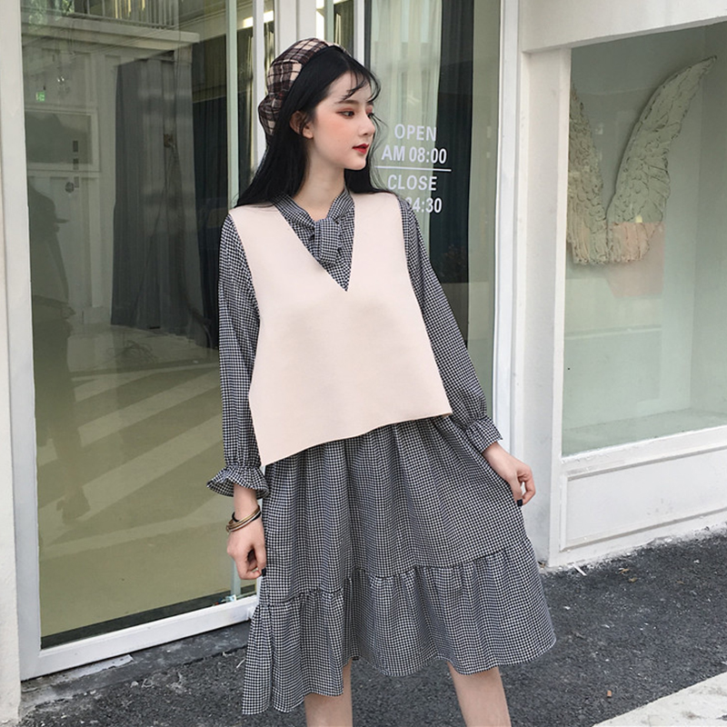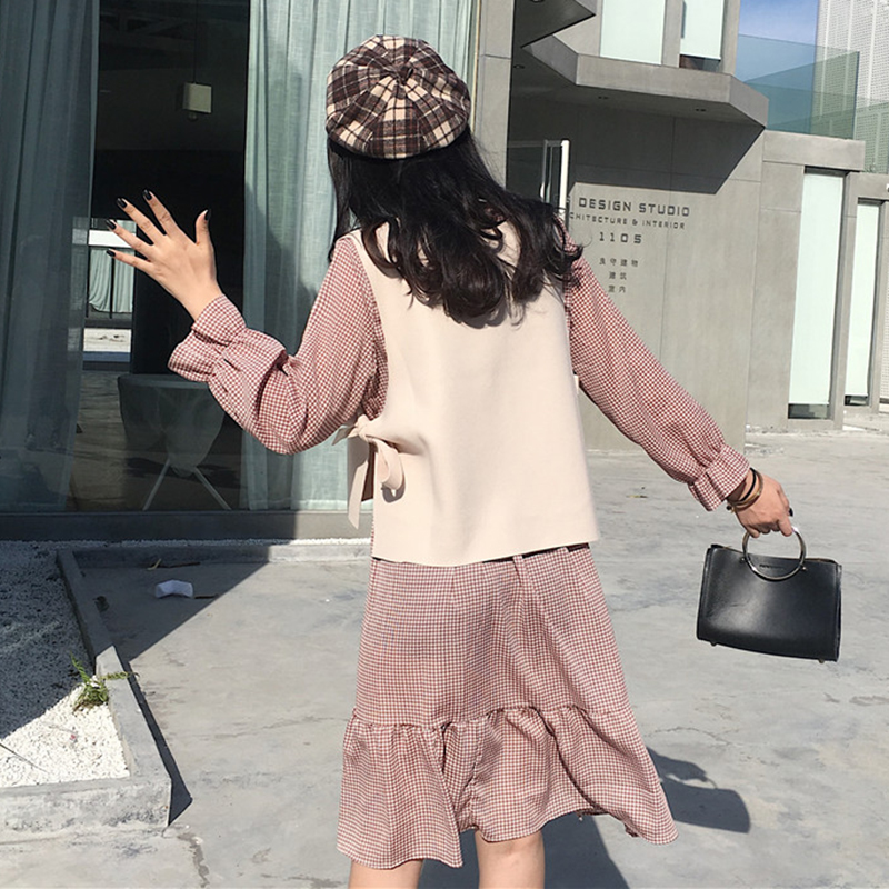 / 時尚套裝女秋冬新款復古格子荷葉邊系帶連衣裙子寬松v領開叉馬甲