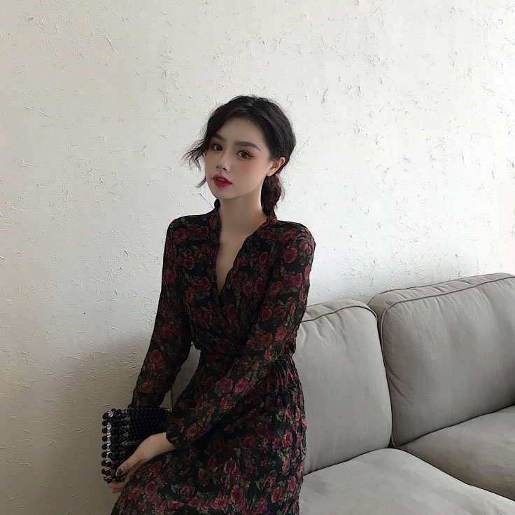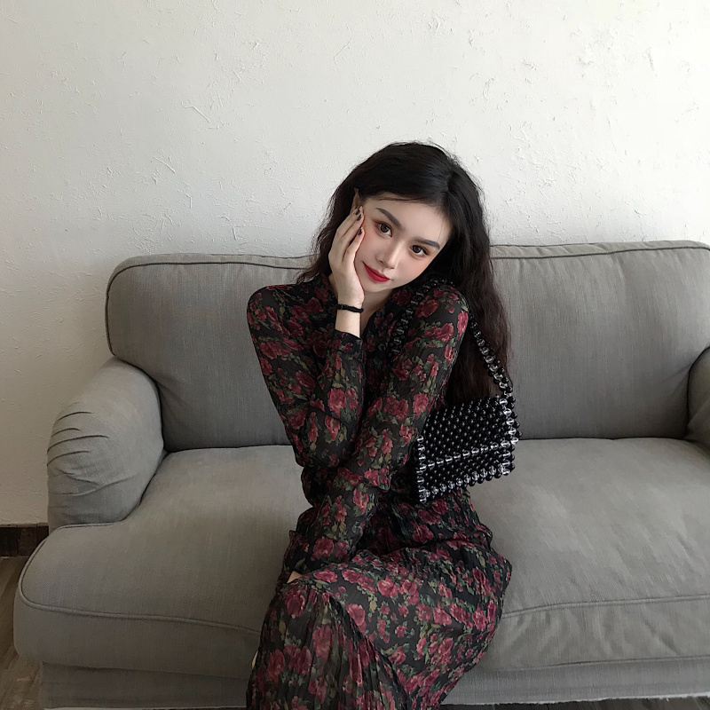 / chic早秋裙子長裙女慵懶風韓版水波紋修身顯瘦長款玫瑰花連衣裙潮