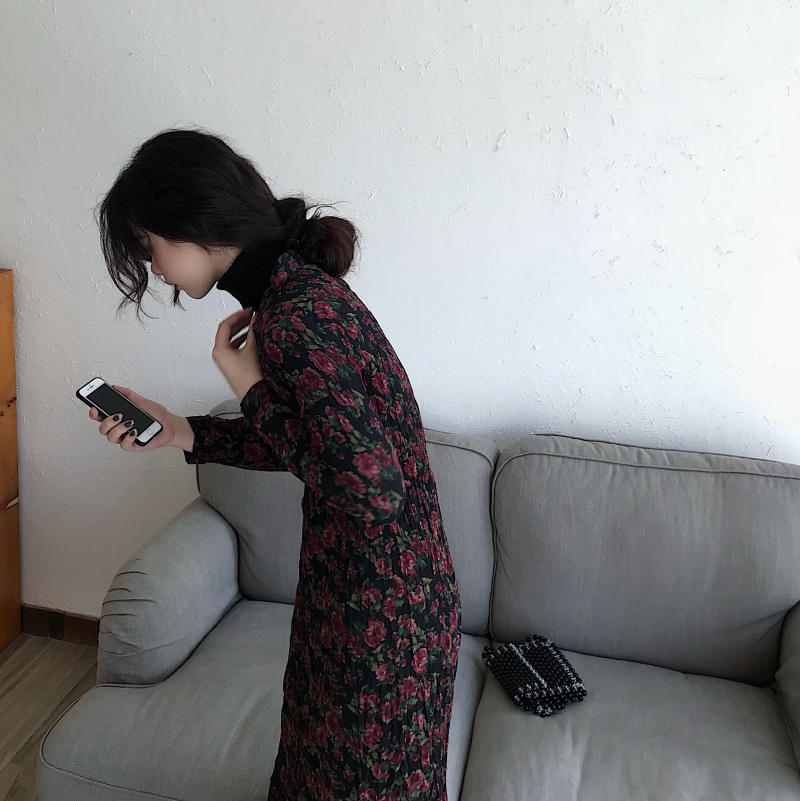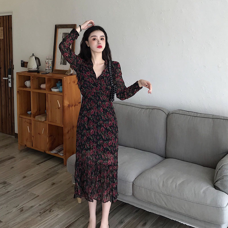 chic早秋裙子長裙女慵懶風韓版水波紋修身顯瘦長款玫瑰花連衣裙潮
