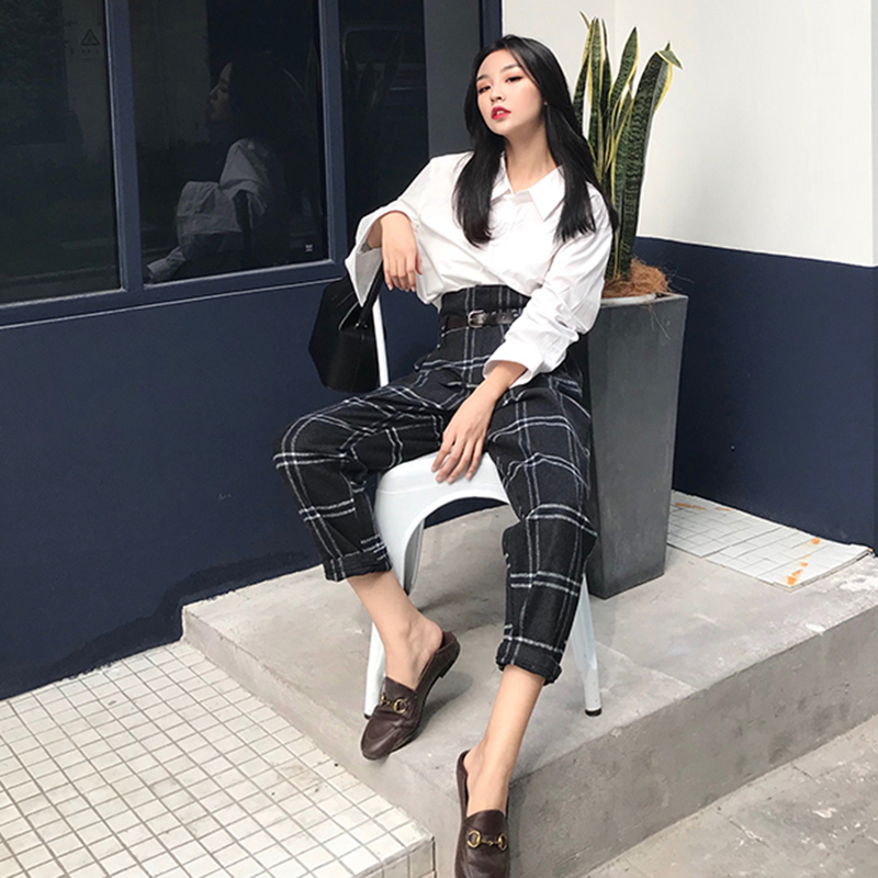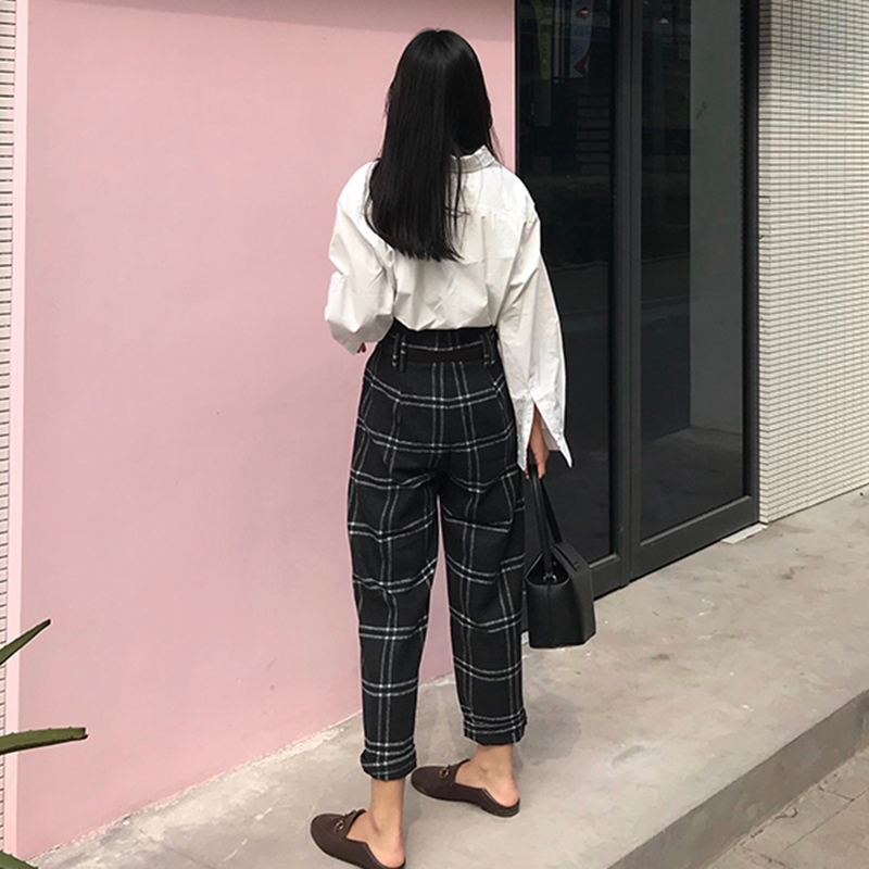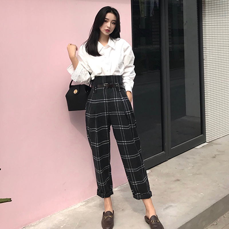 / 港味復古闊腿褲子女秋裝2018新款寬松格子休閑長褲高腰直筒西裝褲
