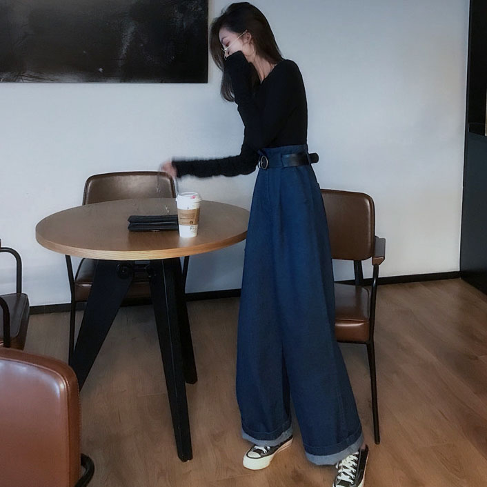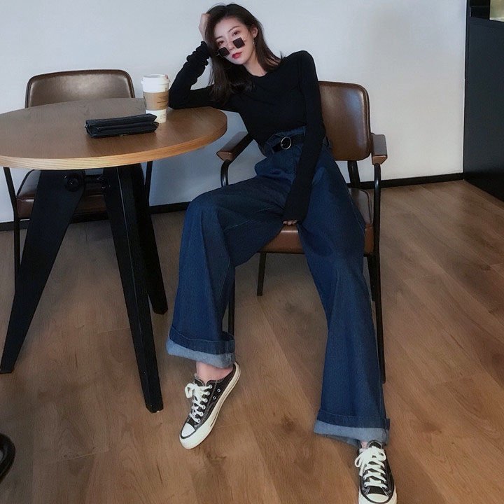時尚復古高腰牛仔褲女秋2018新款韓版寬松顯瘦闊腿直筒牛仔長褲潮