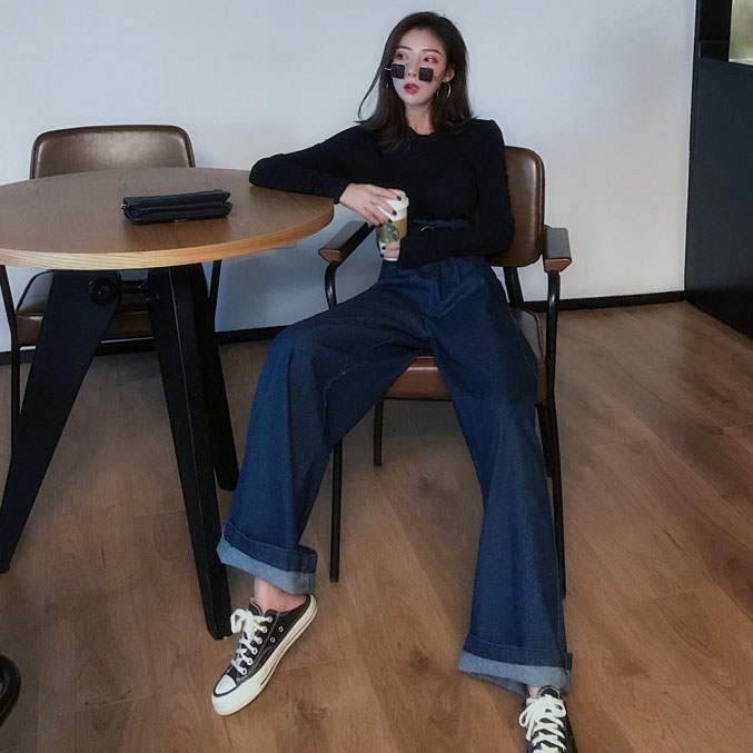 / 復古韓國chic風高腰寬松直筒闊腿牛仔褲女春秋2018新款時尚褲子潮