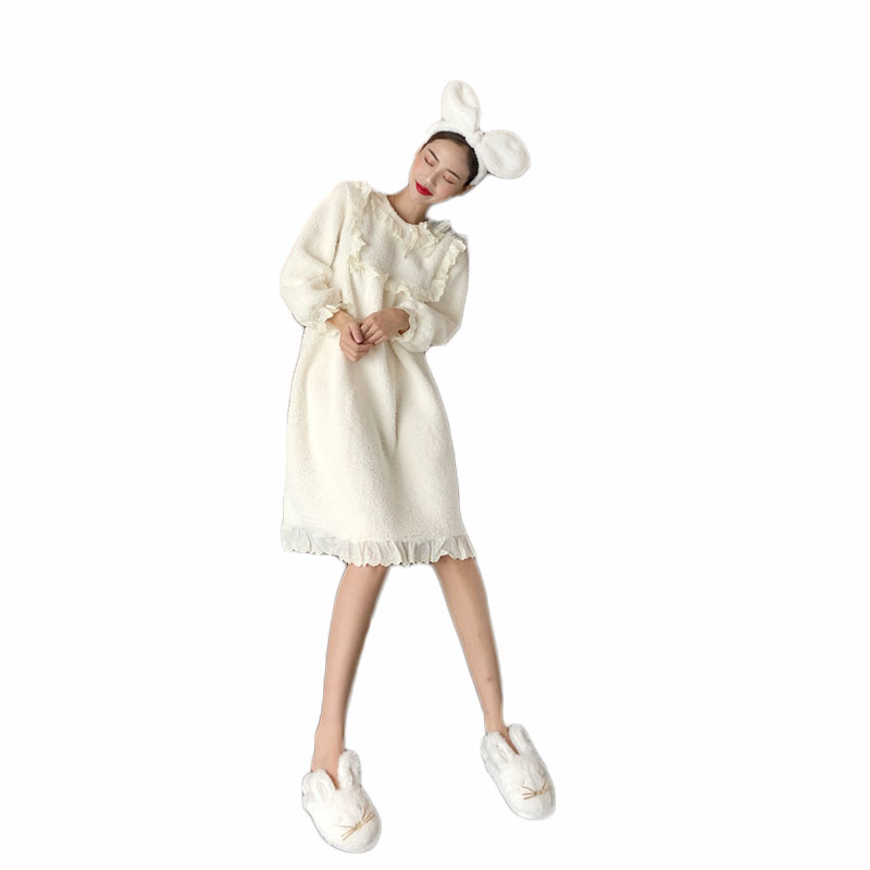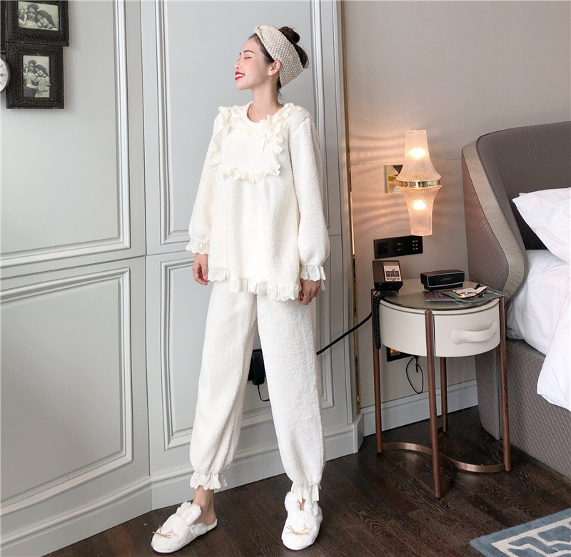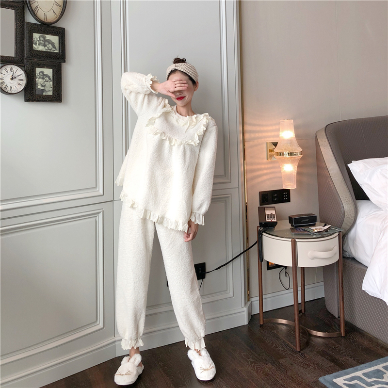 家居服套裝親膚舒適木耳邊時尚加厚保暖連衣裙上衣+長褲居家套裝