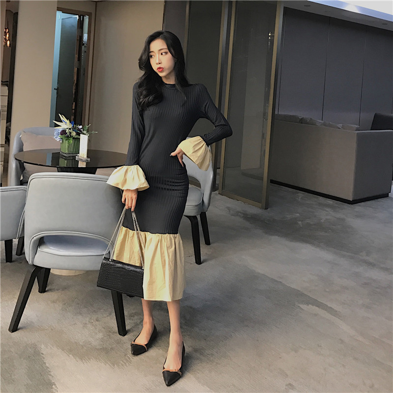 / 晚晚風秋季新款修身顯瘦高領喇叭袖針織拼接荷葉邊chic風連衣裙女