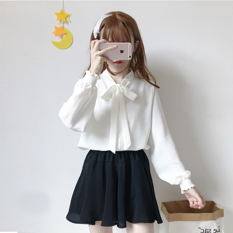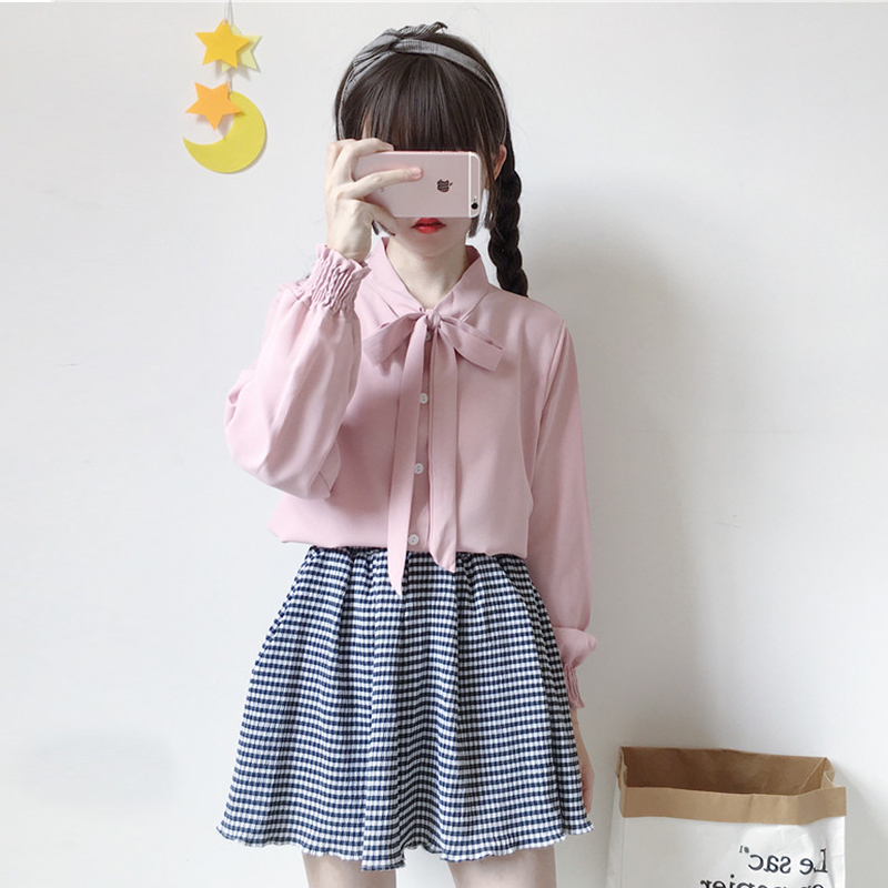 / 秋季女裝韓版氣質簡約純色蝴蝶結系帶襯衣寬松休閑長袖襯衫上衣潮