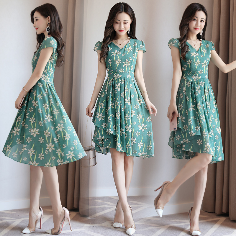 2017夏裝新款短袖收腰顯瘦氣質淑女v領碎花高腰雪紡連衣裙女夏潮