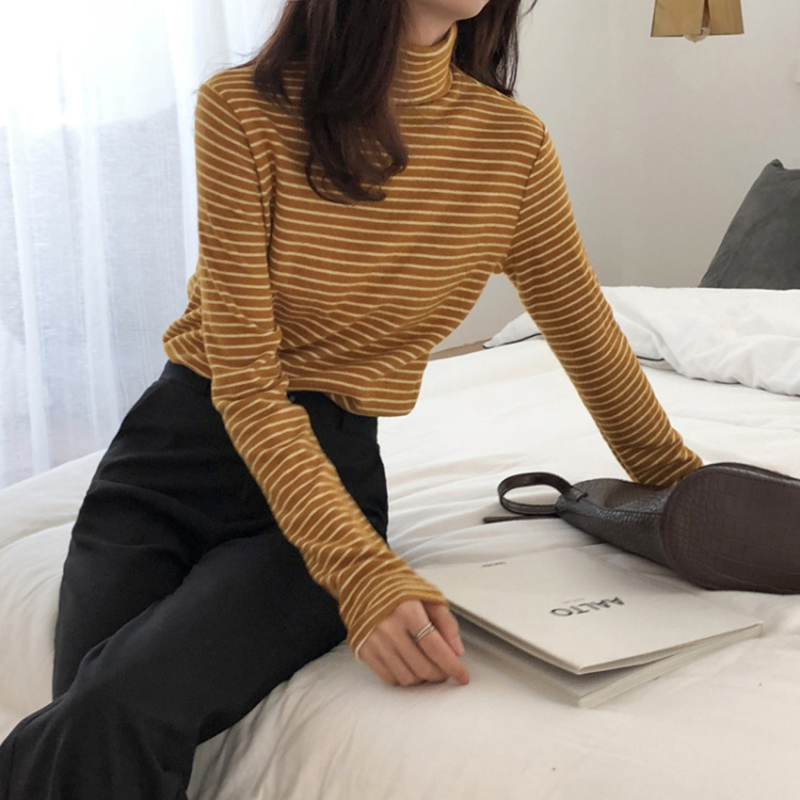 韓版高領條紋T恤女2018秋冬裝新款chic風學生百搭顯瘦彈力打底衫