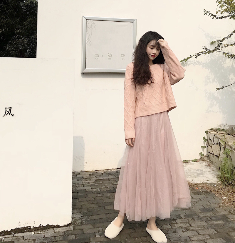/ 冬季新款寬松圓領套頭菱形針織毛衣高腰中長款星星網紗裙時尚套裝