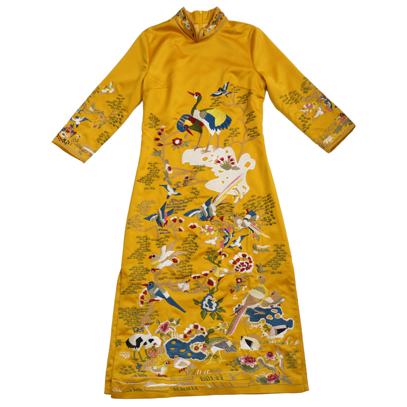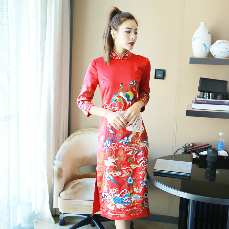 2018春季新款復古淑女修身中式中裙刺繡日常改良旗袍連衣裙中長款