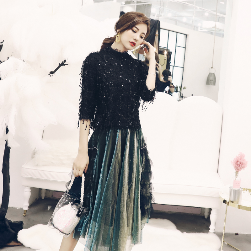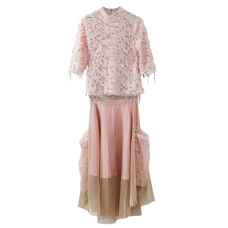 / 名媛氣質港味網紅兩件套2018秋季新款亮片上衣網紗半身連衣裙套裝