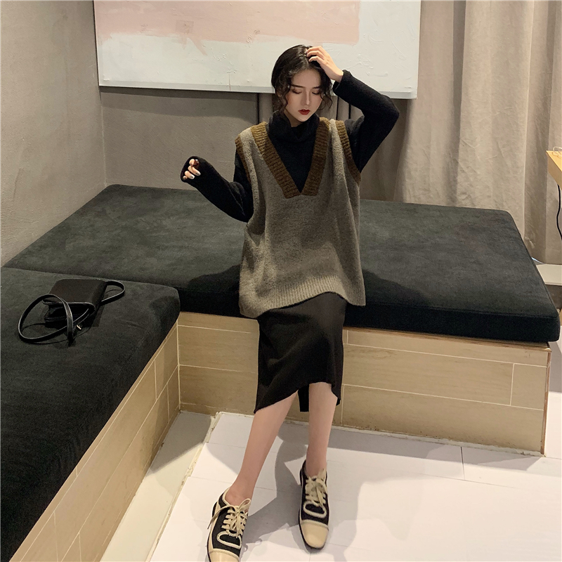 / 港味復古chic新款韓版時尚套裝撞色V領馬甲高領毛衣呢子半身長裙