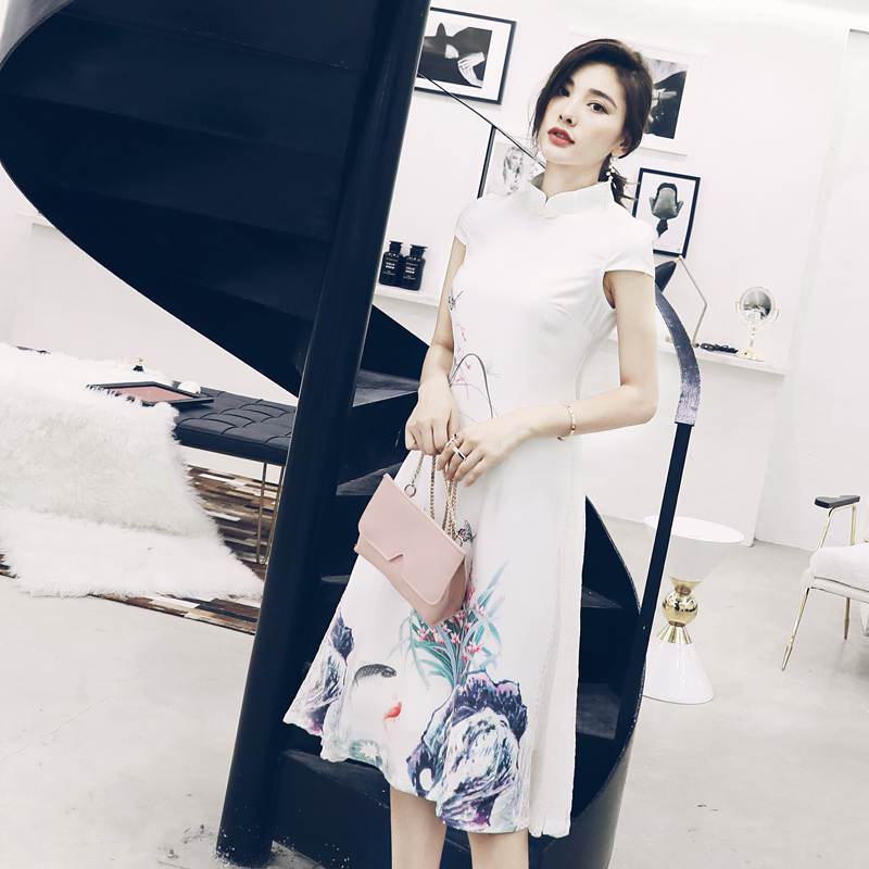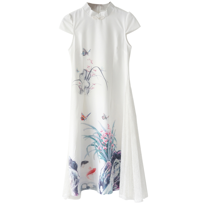 s秀中國風改良旗袍女2018新品復古印花蕾絲拼接大擺裙連衣裙夏