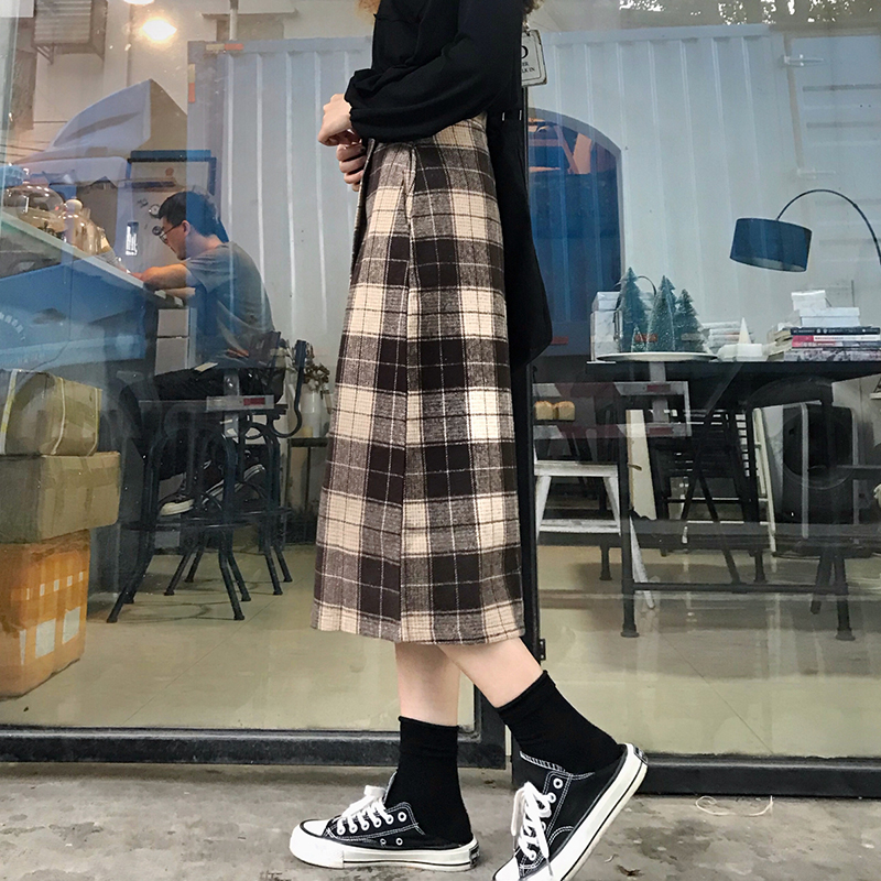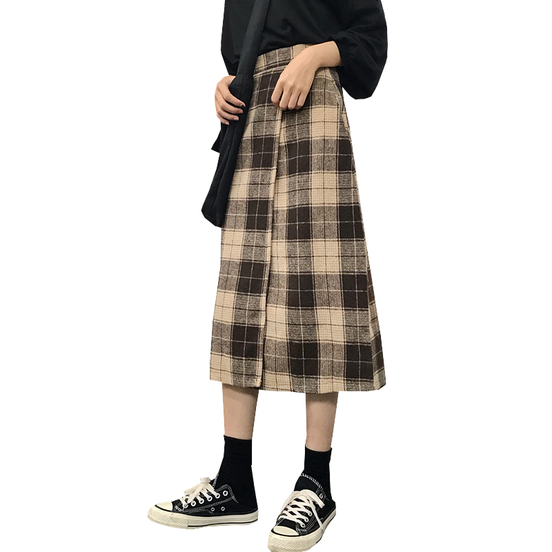 港味復古毛呢格子半身裙女秋裝2018新款顯瘦氣質高腰a字中長裙子