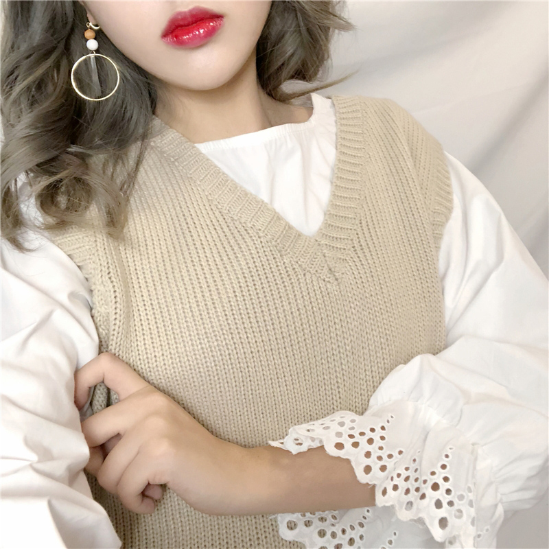 / 兩件套女裝寬松V領針織馬甲背心外搭無袖毛衣+白色長袖襯衫套裝秋