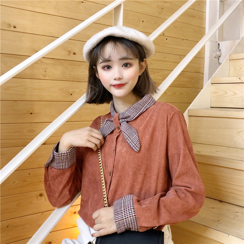 / 秋裝女裝韓版氣質小清新系帶蝴蝶結領燈芯絨長袖襯衣休閑上衣襯衫