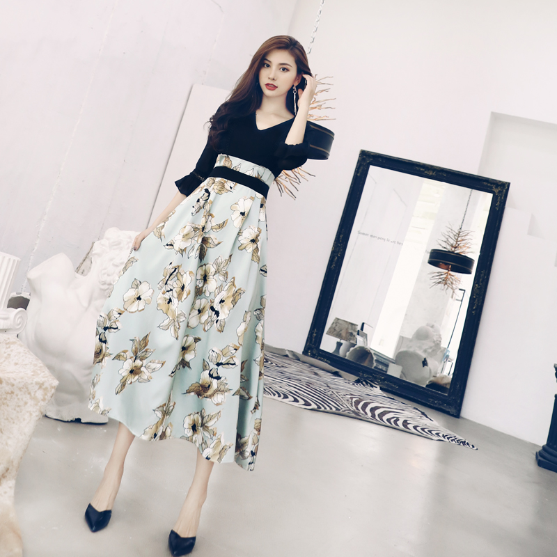 中袖拼接連衣裙女中長款2018秋季新款女裝時尚修身收腰chic早秋裙