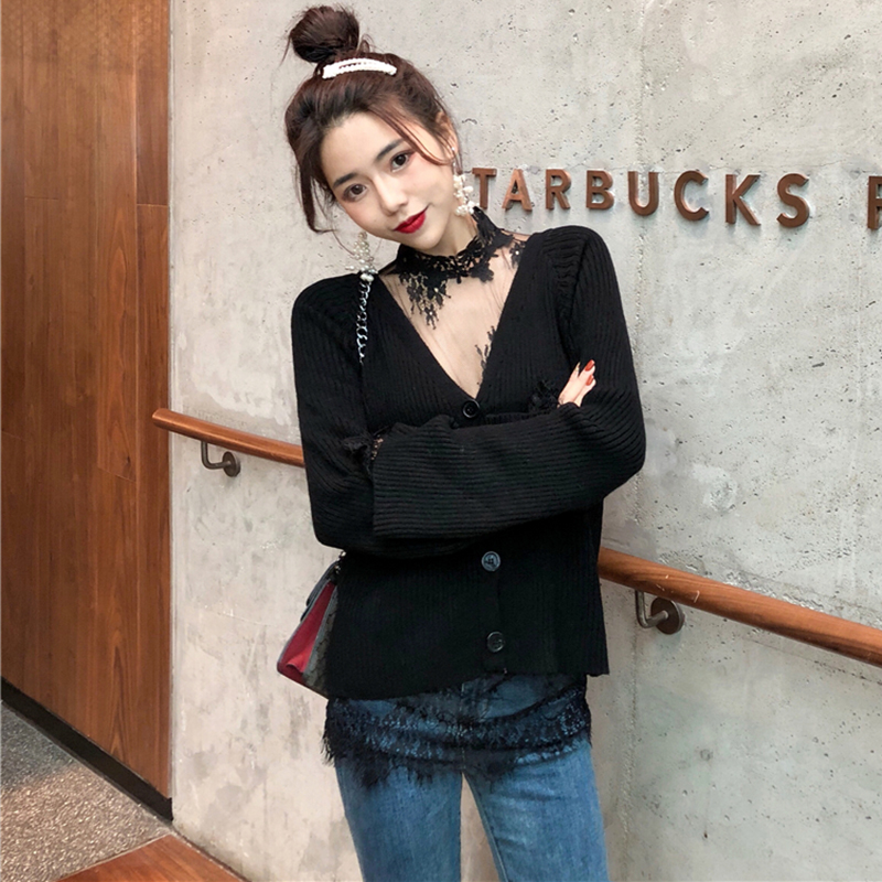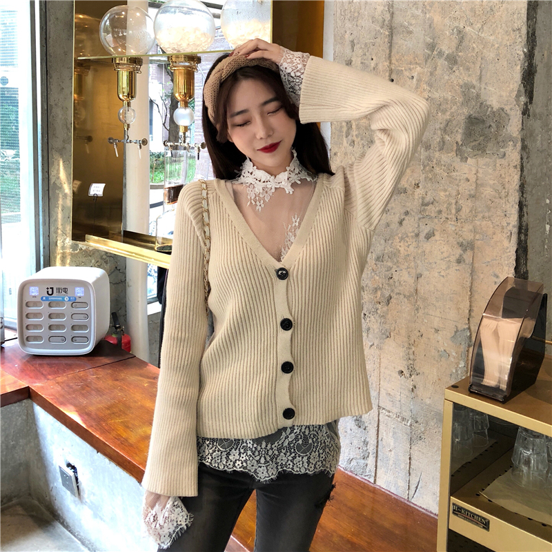 / 氣質女神兩件套冬裝新款時尚透視蕾絲打底衫寬松V領長袖針織開衫