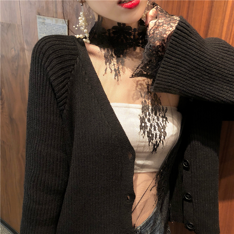 氣質女神兩件套冬裝新款時尚透視蕾絲打底衫寬松V領長袖針織開衫