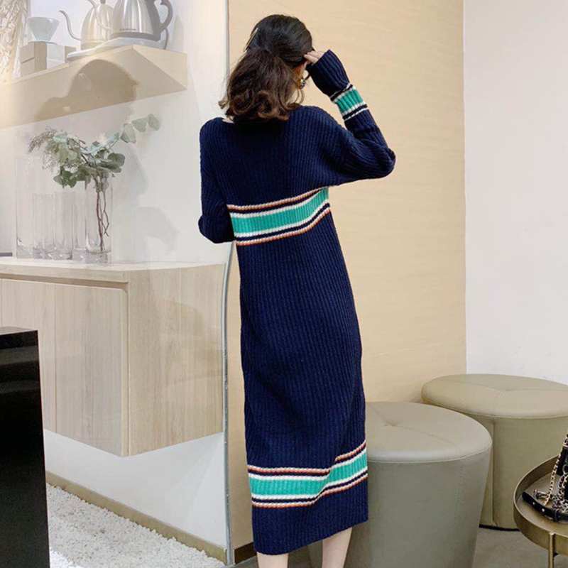 秋冬裝2018新款時尚撞色條紋針織中長裙法式少女egg長袖連衣裙子