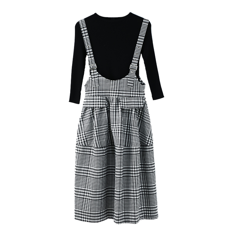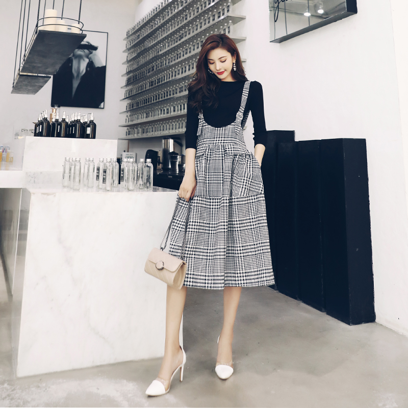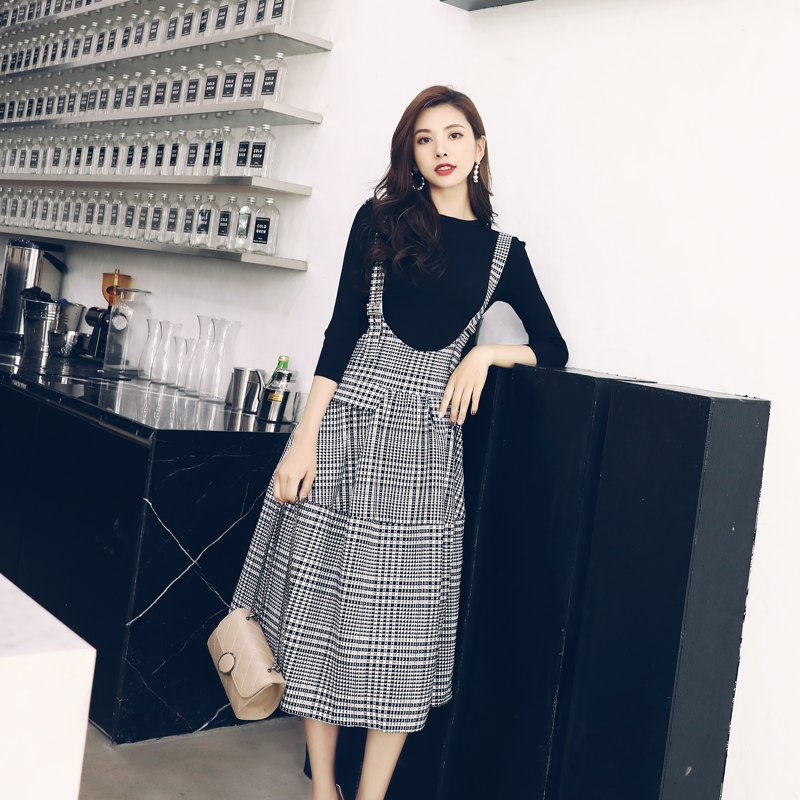 / 名媛千鳥格兩件套女針織衫上衣套裝毛衣2018秋新款氣質背帶連衣裙
