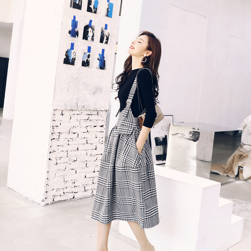 名媛千鳥格兩件套女針織衫上衣套裝毛衣2018秋新款氣質背帶連衣裙